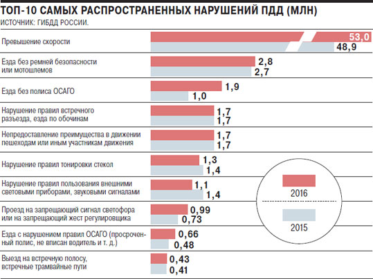 Самыми распространенными видами нарушений традиционно являются превышение скорости и не пристегнутый ремень безопасности. Одной из самых «популярных» статей КоАП, применяемых инспекторами, в 2016 году стала ст. 12.37 — нарушение требований ОСАГО. По первой части статьи (полис ОСАГО есть, но просрочен или не вписан управлявший машиной водитель) оштрафовано 654 тыс. граждан, по второй (управление автомобилем без страховки) — 1,9 млн водителей. По последнему составу прирост составил почти 100%. Лидерами по количеству таких нарушений, следует из данных ГИБДД, являются Краснодарский край (105 тыс. нарушений), Татарстан (101 тыс.) и Московская область (96,2 тыс.)