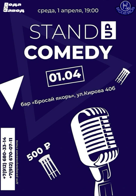 1 апреля в баре «Бросай якорь» (Яхт-клуб «Коматек») состоится стендап-мероприятие. Гостей ждет выступление хедлайнера, ведущего и двух секретных комиков.