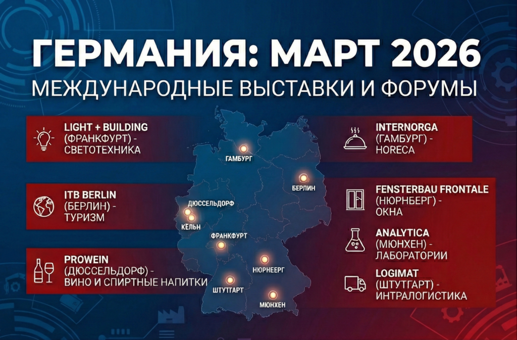В первой половине марта 2026 года в ФРГ запланирован ряд значимых выставок. Месяц откроют крупнейшие площадки в Нюрнберге — IWA OutdoorClassics (охота и стрелковый спорт) и выставка-мировой лидер в области встраиваемых систем embedded world. В Берлине состоится флагманская туристическая биржа ITB Berlin, а Франкфурт-на-Майне примет ведущую выставку светотехники и автоматизации зданий Light + Building. Международная выставка скобяных изделий EISENWARENMESSE пройдёт в Кёльне, форум интеллектуальных транспортных решений IT-TRANS – в Карлсруэ и специализированное мероприятие в сфере аналитики данных succeet — в Висбадене.